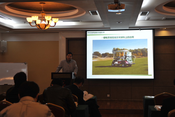 會(huì)議第二項(xiàng)內(nèi)容由綠友集團(tuán)OHEV事業(yè)部張得玉先生匯報(bào)鋰電系統(tǒng)在高爾夫球場(chǎng)上的應(yīng)用。這是個(gè)全新的課題,大家聽(tīng)得非常認(rèn)真。在高爾夫業(yè)內(nèi)現(xiàn)階段使用的都是鉛酸電池,張得玉先生從鉛酸電池對(duì)環(huán)境的污染和鉛酸廢舊電池如何處理,以及鉛酸電池性能與鋰電電池性能的巨大差距等幾個(gè)方面匯報(bào)了行業(yè)內(nèi)目前的狀況。由于鉛酸電池本身性能上有缺陷,使用壽命短,業(yè)內(nèi)以后的發(fā)展趨勢(shì)一定會(huì)向著更加環(huán)保、安全和性能卓越方面發(fā)展,綠友集團(tuán)走在了行業(yè)的前面。
