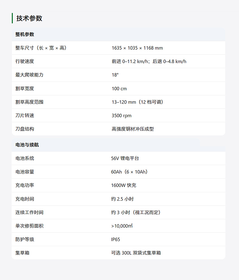 - ● 長效續(xù)航能力:60Ah 大容量電池平臺,2.5 小時快充,單次修剪面積可超過 10,000㎡。