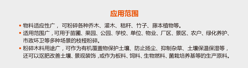 適用范圍廣,可用于苗圃、果園、公園、學(xué)校、單位、物業(yè)、廠區(qū)、景區(qū)、農(nóng)戶、綠化養(yǎng)護(hù)、市政環(huán)衛(wèi)等多種場景枝椏粉碎,最大粉碎直徑10cm。